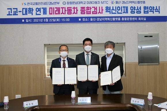 교통안전공단 경남본부와는 교통안전을 위한 수소·전기자동차, 자율주행자동차 등 도내 미래자동차 종합검사 전문인력을 고교-대학 연계 교육을 통해 양성하기로 협약했다.