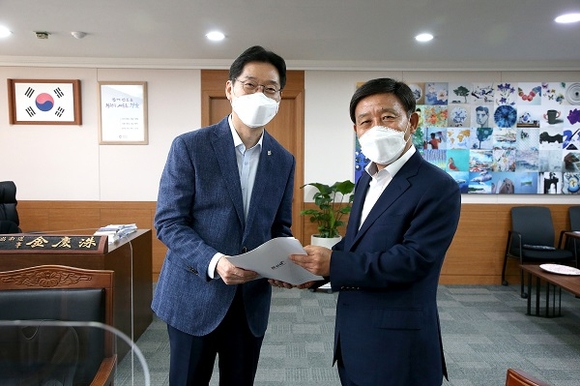 허성곤 김해시장은 22일 경남도청 대회의실서 열린 '경남 탄소중립추진위원회' 출범식에 참석한 자리에서 김경수 도지사를 만나 지역 주요 현안을 건의했다.