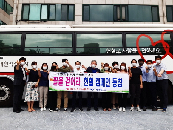 한국전력공사 남부산지사는 코로나19로 인한 헌혈인구 감소로 혈액 수급난 지속에 따라 지역사회와 어려움을 함께하고자 24일 지사 주차장에서 ‘팔을 걷어라’ 헌혈 캠페인에 참여했다.