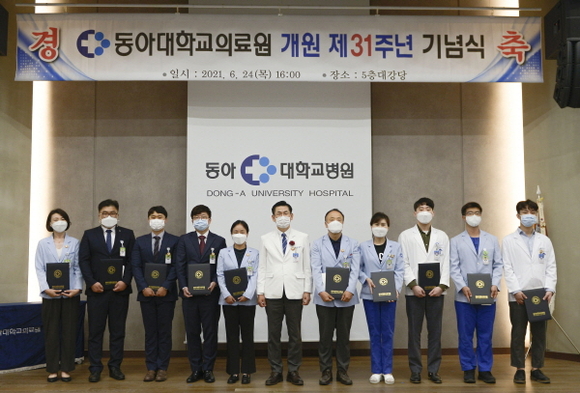 24일 열린 동아대학교병원 개원 31주년 기념식에서 안희배 원장과 수상자들이 기념촬영을 하고 있다. (사진=동아대병원 제공)