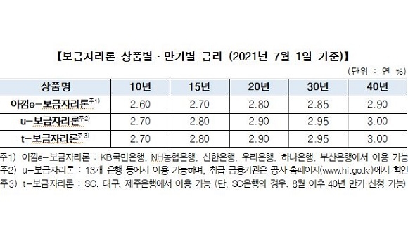이에 주금공 홈페이지에서 신청하는 'u-보금자리론‘과 은행 창구에서 신청하는 ’t-보금자리론‘은 내달 1일부터 대출 만기에 따라 연 2.70%(만기 10년)에서 최대 3.00%(40년)로 이용할 수 있다.