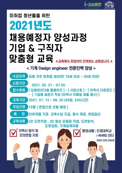 인제대학교가 수탁 운영하는 김해청년다옴이 ‘기계 디자인 엔지니어 전문인력 양성’ 참가자를 모집한다.