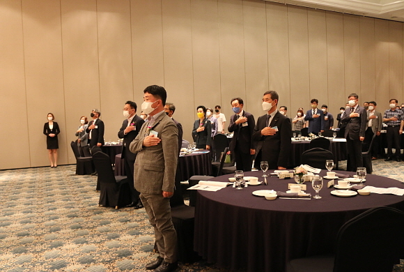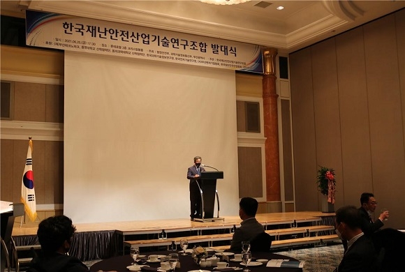 지난 25일 오후 5시 롯데호텔 부산에서 ‘한국재난안전산업기술연구조합’ 발대식이 열린 가운데 심술진 이사장이 기념사를 전하고 있다.