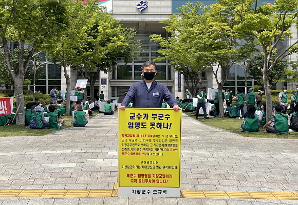 오규석 기장군수가 28일 오전 11시 40분경 부산시청 시민광장을 찾아 부산시에 ‘부군수 임명권 반환’을 촉구하는 67번째 시위를 열고 있다.