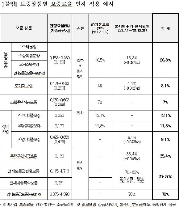 또 전세보증금반환보증의 보증료율을 70~80%, 임대보증금보증의 보증료율을 70%, 기타 분양보증 등 9개 보증상품의 보증료율을 4.1~35.4% 인하해 올 연말까지 한시 할인 적용한다.