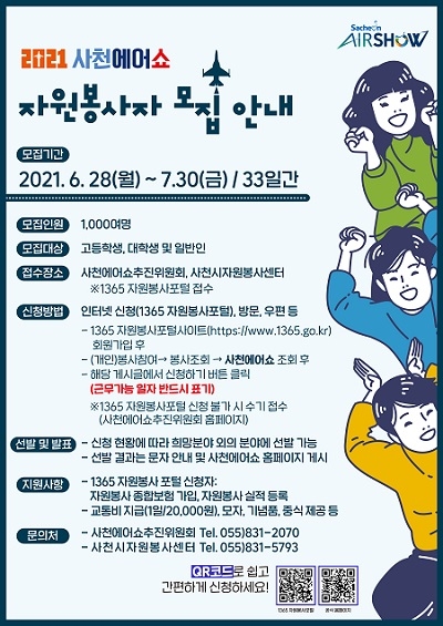 이번 '2021 사천에어쇼' 자원봉사자 모집 관련 자세한 내용은 사천에어쇼 홈페이지를 참고하거나 사천에어쇼추진위원회 또는 사천시자원봉사센터로 문의하면 된다.
