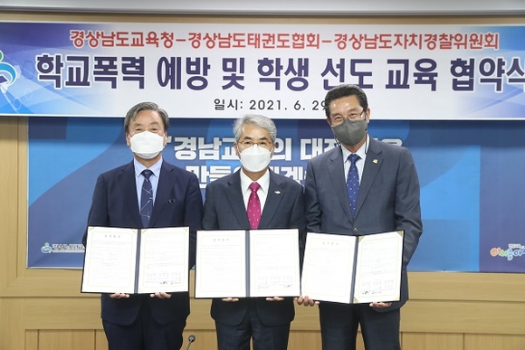 경남도교육청은 29일 경남도자치경찰위원회, 경남도태권도협회와 '학교폭력 예방 및 학생 선도 교육'을 위한 업무협약을 체결했다.