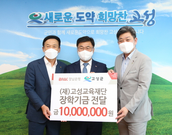 이날 최홍영 은행장은 고성군청을 방문해 백두현 군수와 고성교육재단 김성진 이사장에게 ‘장학기금 기탁증서’를 전달했다. 경남은행이 기탁한 장학기금 1000만원은 (재)고성교육재단을 통해 학교지원사업과 장학사업 재원으로 쓰일 예정이다.