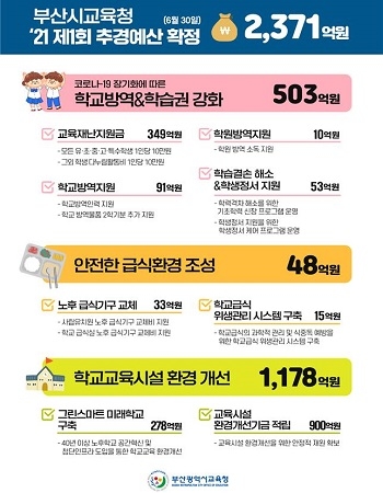 부산시교육청이 지난달 30일 부산시의회 의결을 거쳐 올해 첫 부산시 교육비특별회계 추가경정(추경) 예산 2371억원을 확정했다고 1일 발표했다.