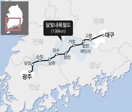 대구와 광주를 잇는 달빛내륙철도는 총연장 199km에 이르며 총사업비 4조 5천여 억원이 소요되는 전액 국비사업으로 10개 시군(대구-고령-합천-거창-함양-장수-남원-순창-담양-광주)을 경유하여 대구~광주를 1시간대로 연결하게 된다.