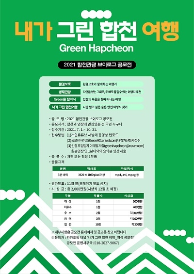 본 공모전은 '내가 그린(Green) 합천 여행'이라는 주제로 관광과 환경을 접목시켜 합천의 청정, 힐링, 웰니스 관광을 담았다. 1회용품 안 쓰기, 쓰레기 줍기 등 환경보호가 함께하는 여행기, 자연을 있는 그대로 즐기는 생태관광, 나만 알고 싶은 숨은 합천 여행지를 찾아 내가 그리는 여행 등 지원자들의 재기 넘치는 이야기를 기다린다.