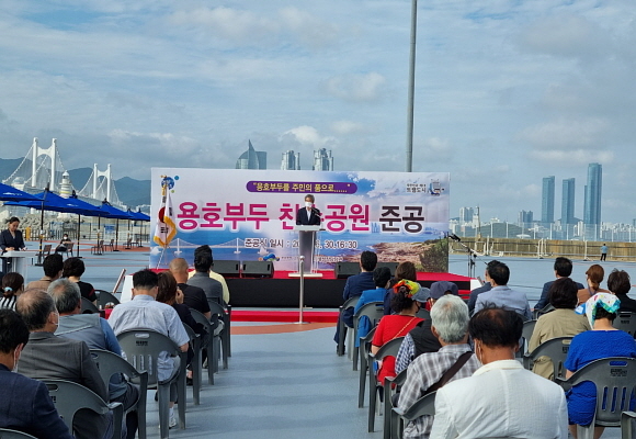 지난달 30일 부산 용호부두 친수공원 준공식이 열린 가운데 남기찬 BPA 사장(맨 앞)이 친수공원 개관을 기념해 기념사를 전하고 있다.