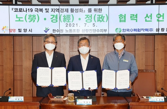 경남 밀양시와 한수원 삼랑진양수발전소, 한수원노동조합 삼랑진양수지부가 5일 밀양시청 회의실에서 코로나19 극복 및 지역경제 활성화를 위한 노·경·정 협력 공동 선언문을 발표했다.