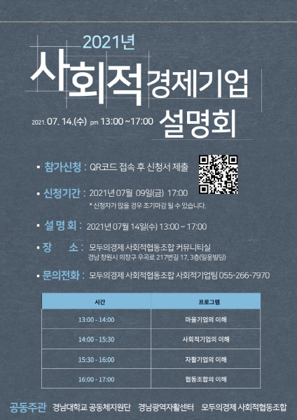 이번 설명회는 경남도가 주최하고 경남대 공동체지원단, 경남광역자활센터, 모두의경제 사회적협동조합, 경남사회적경제통합지원센터가 주관한다.