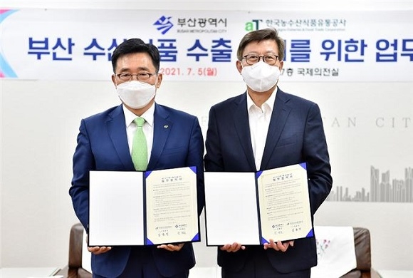 부산시와 aT는 지난 5일 늦은 오후 부산시청 7층 국제의전실에서 ‘부산지역 수산식품 수출 확대 위한 협력’ 업무협약을 체결했다고 6일 밝혔다.