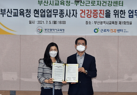 부산시교육청이 ‘제54회 산업안전보건의 날’을 맞아 지난 5일 오후 시교육청 제1회의실에서 부산근로자건강센터와 ‘현업종사자 건강증진 활동 위한 업무협약’을 체결했다고 6일 밝혔다.