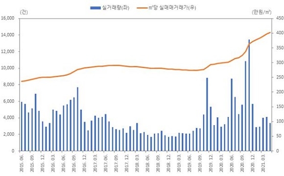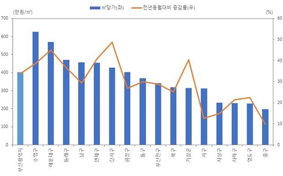 지난 5월 기준으로 ㎡당 아파트 매매가는 수영구, 해운대구, 동래구 등의 순으로 높게 나타났으며 이들 지역의 매매가는 지난 2019년 11월 이후 상승세를 이어가고 있다.