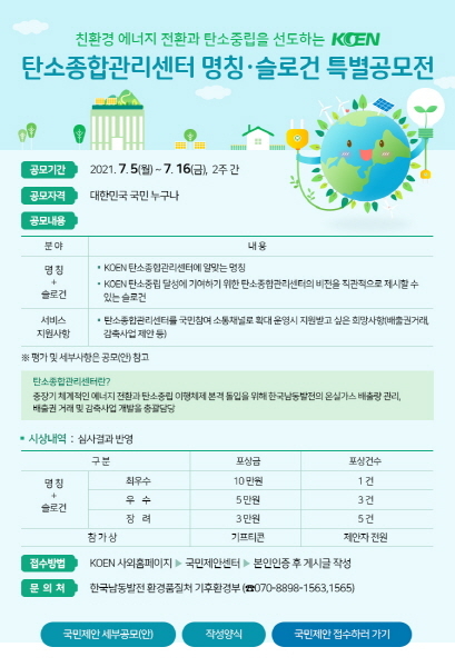 남동발전은 이번 명칭 및 슬로건 공모를 통해 현재 운영 중인 KOEN 탄소종합관리센터의 역할과 기능에 대해 내·외부 고객에 홍보하고, 2050 탄소중립 선도적 이행을 위한 역할 재편의 기회로 활용할 계획이다.