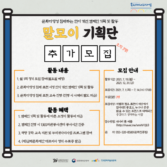 말모이 기획단은 차별과 혐오 표현이 없는 세상을 꿈꾸는 누구나 참여 가능하며, 신청은 네이버 폼에서 가능하다. 추가 모집 인원은 총 3명으로 선정 및 발표는 16일 개별 안내될 예정이며 자세한 내용은 재단 홈페이지나 인스타그램에서 확인하면 된다.