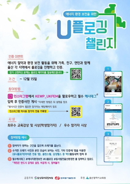 에너지와 환경에 관심을 가진 울산시민과 학생 누구나 참여 가능하며, 인스타그램이나 카카오톡(QR코드 스캔)을 통해 신청하면 된다. 참가자들에게는 에코백, 생분해 봉투, 집게, 장갑 등으로 구성된 플로깅 패키지(선착순 200명)를 지원한다.
