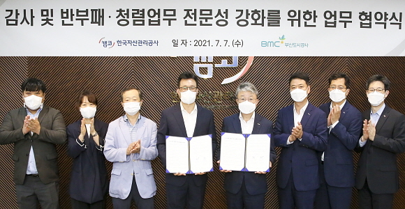 한국자산관리공사(캠코)와 부산도시공사가 7일 캠코 부산 본사에서 ‘감사·청렴 업무 전문성 강화를 위한 업무협약’을 체결했다고 밝혔다.