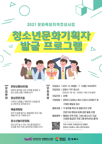 김해문화재단 문화도시센터는 ‘청소년 문화기획자 발굴 프로그램’ 참여자를 오는 12일까지 모집한다. 대상은 문화기획에 관심 있는 김해시 거주 만 13세부터 18세까지 청소년(2003년 1월~2008년 12월 출생) 20명이다.