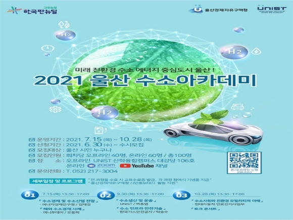 울산경제자유구역청과 울산과학기술원 저차원탄소 혁신소재연구센터가‘2021 울산 수소아카데미’에 참여할 수강생을 모집하고 있다.