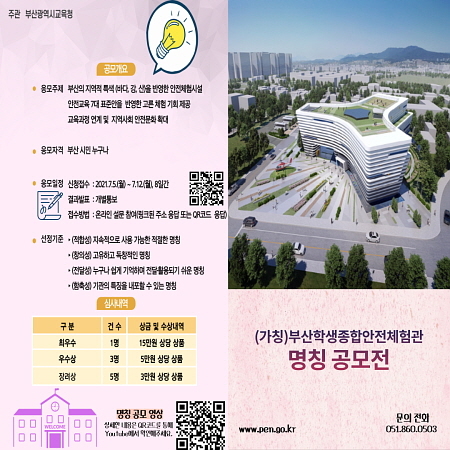 시교육청에 따르면 이번 명칭 공모전은 부산의 지역적 특색을 반영한 독창적이고 누구나 쉽게 부를 수 있는 안전체험관 이름을 선정하기 위해 추진한 것이다.