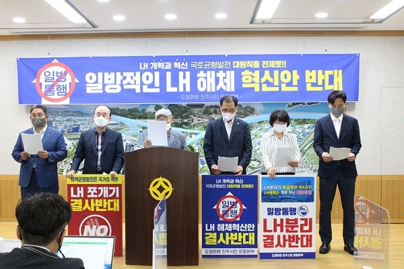 운동본부는 “지난달 7일 정부가 발표한 LH혁신안이 지역사회의 여론은 무시한 채 일방적으로 추진되는 것을 극명하게 반대한다”며 “진주혁신도시의 근간인 LH해체로 국가균형발전의 의미를 퇴색시키고, 지역소멸위기로 내몰고 있다”고 주장했다.