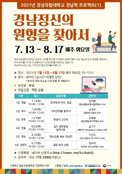 경상국립대 고문헌도서관은 오는 13일부터 8월 17일까지 매주 화요일 오전 10시부터 2시간 동안 경남학 분야 전문가 강의를 진행한다. 이번 강좌는 코로나19 상황을 고려해 온라인으로 진행하며, 하계 및 동계 방학을 이용해 연간 두 차례 시행할 예정이다.