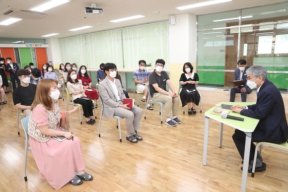 박 교육감과 교무행정팀 간담회에서 김규읍 교사는 “2021년에는 방과후학교실무원이 추가 배치되고, 교육지원청에 학교통합지원센터가 설치되어 2020년에 비해 담임선생님들의 업무를 많이 덜어내어 지원할 수 있게 되었다. 교무행정팀의 지원으로 담임선생님들이 수업준비와 아이들과 소통할 수 있는 시간을 더 많이 가지게되어 뿌듯하다”는 의견을 밝혔다.