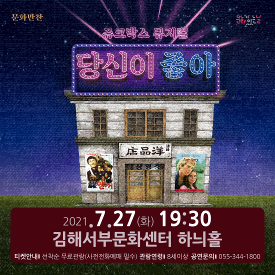 뮤지컬 ‘당신이 좋아’는 문화체육관광부 주최, 김해문화재단 김해서부문화센터와 한국문화예술회관연합회 주관으로 진행하는 ‘문화만찬’ 시리즈의 2번째 공연이다. 첫 공연이었던 클래식 ‘생상스-동물의 사육제’는 공연 티켓 오픈 당일 전 좌석 매진, 예매 대기자가 이백여 명에 육박하기도 했다.