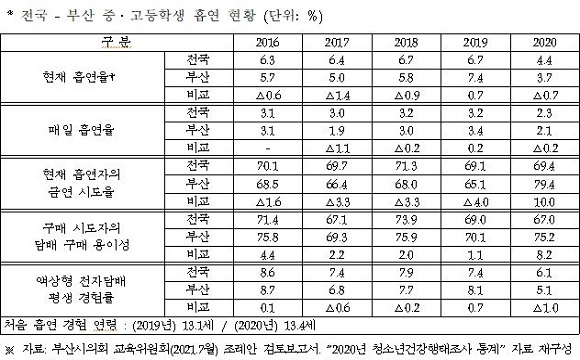 이 의원은 “부산지역 중·고등학생의 흡연율이 전국 평균보다 낮다곤 하지만 학생에 대한 흡연 예방활동과 금연 지원을 위한 대책은 강조해도 지나치지 않다. 학생의 건강한 성장을 위해 적극적으로 지원해 나가겠다”며 “시교육청 조례뿐 아니라 금연환경 조성에 대한 부산시 조례에 대한 보완 작업도 현재 초록우산어린이재단과 함께 진행 중이다”라고 전했다.