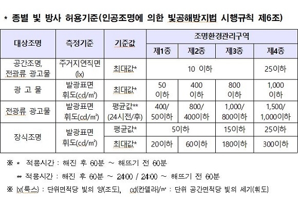 대상조명은 3가지로 ▲공간조명(가로등, 보안등, 공원등) ▲허가 광고물(관리법에 따라 허가를 받아야 하는 옥외광고물 조명) ▲장식조명(건축물, 교량, 숙박업소 등 설치 조명)이다. 빛 방사 허용기준은 관리구역 1종에서 4종으로 갈수록 높아진다.