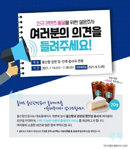 UPA 관계자는 “이번 설문조사는 울산항 종사자가 원하는 콘텐츠를 홈페이지를 통해 제공해 소통창구의 역할을 강화하기 위함”이라며, “다양한 정보와 서비스를 제공하는 고객 친화형 홈페이지 개편을 통해 언제든지 찾아오는, 찾고 싶은 홈페이지로 만들어가겠다”고 밝혔다.