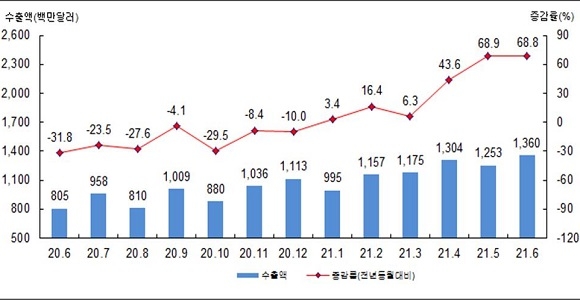 지역별로는 EU로의 수출이 6월 224.1% 증가하며 7개월 연속 증가했다. 이외에도 ▲중국(81.6%) ▲미국(60.1%) ▲중남미(57.9%) ▲동남아(41.5%) ▲일본(13.6%) 6대 지역으로의 수출도 3개월 연속 증가세를 기록했다.