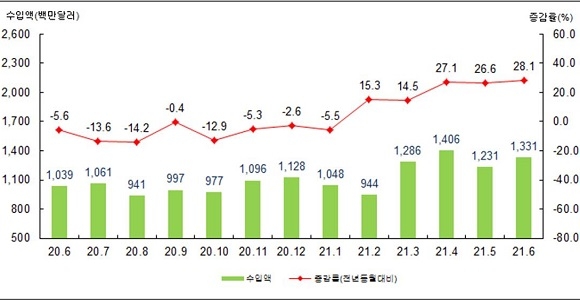 수입은 경기 회복과 투자·소비 심리 개선에 따라 원자재(52.4%), 자본재(12.8%), 소비재(16.1%) 등의 수입이 5개월 연속 증가세를 나타냈다.