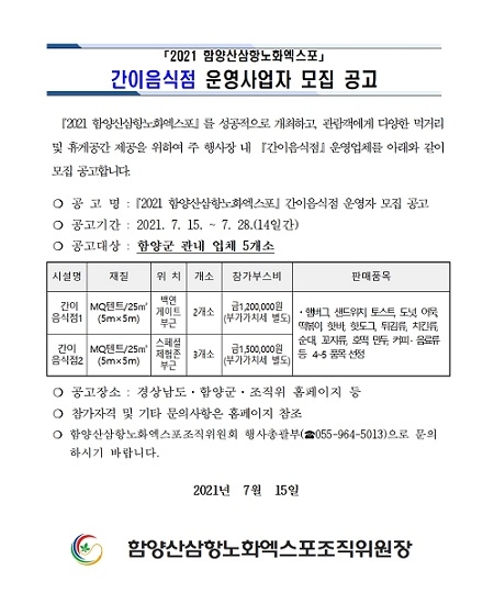 이번 공모에 대한 세부사항은 엑스포조직위·경남도·함양군 누리집에서 확인할 수 있으며, 간이음식점 선정에 관한 보다 자세한 사항은 조직위원회 행사총괄부로 문의하면 된다.