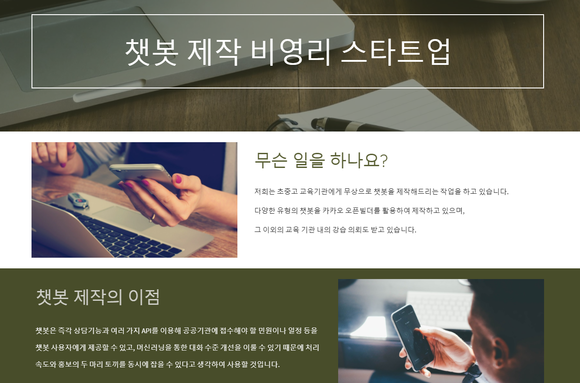 부산 부흥고 학생들이 제작한 ‘챗봇 제작 스타트업’ 홈페이지 소개문 (사진=홈페이지 캡처)