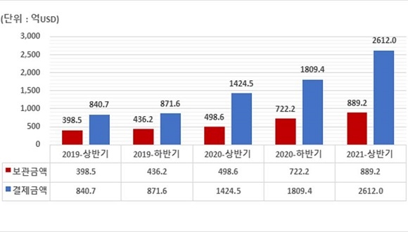 특히 외화증권 결제금은 직전 반기에 비해 44.3%(802억 6000만 달러) 증가했다. 이번 반기 기록만 놓고 봐도 지난해 연간 결제금액의 80.8%에 달하는 것으로 나타났다.
