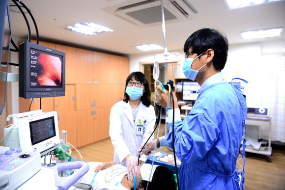 기관지내시경을 실시하는 옥철호 교수. (사진=고신대병원 제공)