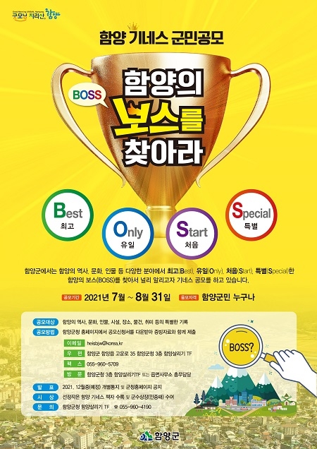 19일 군에 따르면 함양 기네스북 제작을 위해 함양의 역사, 문화, 인물 등 다양한 분야에서 최고(Best), 유일(Only), 처음(Start), 특별(Special)한 '함양의 보스(Boss)를 찾아라' 공모에 들어간다.