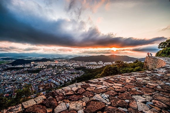▲김해시가지= 최근 새롭게 경남 안심관광지로 선정된 분산성은 왜구의 침략을 막기 위해 축성한 산성이다. 담을 따라 시원한 바람을 맞으며 걸어도 좋고 김해평야와 김해시가지가 한눈에 내려다보이는 탁 트인 전망도 좋다. 해질녘 '왕후의 노을'도 유명하다.