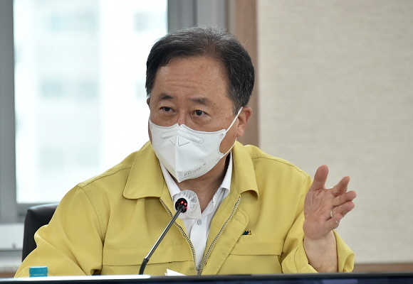 지난 19일 오전 부산시교육청 별관 전략회의실에서 ‘2021 주요 업무 중간성과 보고회’가 열린 가운데 김석준 시교육감이 회의를 주재하고 있다. 이날 회의는 오승현 부교육감과 국·과장 간부 등이 참석한 가운데 부서별 역점 과제와 주요 업무 추진상황, 중간 성과를 점검하는 시간을 보냈다. (사진=부산시교육청 제공)