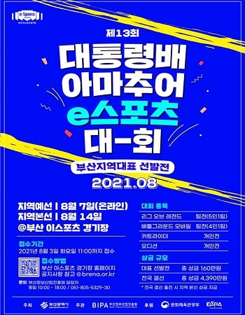 (재)부산정보산업진흥원과 부산시가 국내 최대 아마추어 e스포츠 행사인 ‘제13회 대통령배 아마추어 e스포츠 대회’에 출전할 부산 지역 예선을 온·오프라인으로 진행한다고 20일 발표했다.