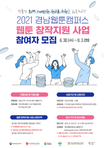 경남문화예술진흥원은 도내 웹툰 창작 활성화를 위해 ‘2021 경남웹툰캠퍼스 웹툰 창작지원 사업’ 참여자를 모집한다.