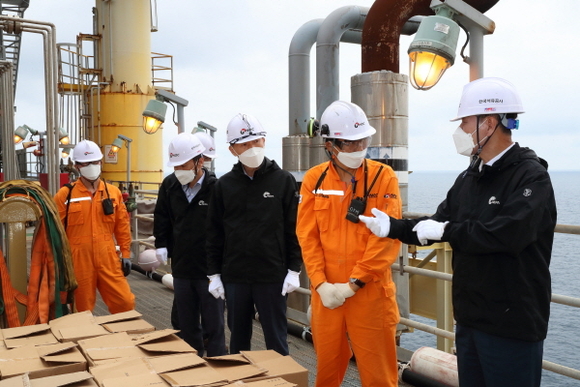 한국석유공사 김동겁 사장이 21일 우리 영해에서 천연가스를 생산해 국가 에너지 안보확립에 기여하고 있는 동해가스전 생산플랫폼을 방문, 현장 생산시설의 안전 및 운영상태를 점검하고 근무자들에게 다가오는 미래 신재생에너지 시대를 위한 차질 없는 준비를 주문했다.