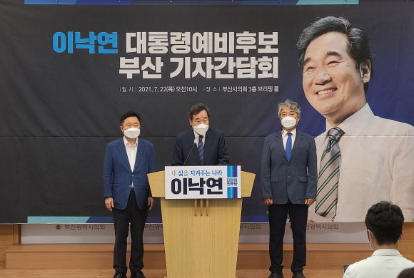 내년 3월 대선 출마를 선언한 이낙연 더불어민주당 예비후보가 22일 부산을 찾아 오전 10시 부산시의회 브리핑실에서 기자회견을 열고 그의 공약 사항 등을 발표했다.