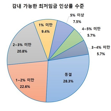 조사결과에 따르면 전체 기업 가운데 58.5%가 최저임금 동결을 희망한 것으로 응답했다. 삭감이 필요하다는 입장을 밝힌 기업은 5.7%며 나머지 35.8%는 ‘소폭 인상’은 감내할 수 있다고 응답했다.
