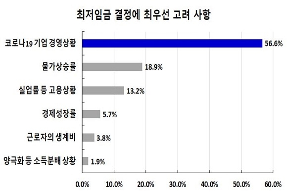 조사 응답기업들 가운데 과반인 56.6%가 최저임금 결정에 ‘코로나19 사태 위기 상황을 최우선으로 고려해 달라’고 요구했다. 이어 ‘물가상승’ 18.9%, ‘고용상황’ 13.2%, ‘경제성장률’ 5.7% 등의 순으로 최저임금 상승률 고려 요구가 있는 것으로 확인됐다.